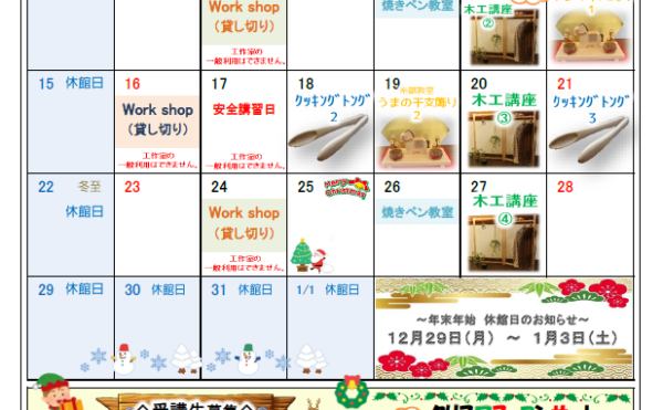 2025年11月26日おしらせadmin 12月の工作室ご利用について (11月26日現在)いつも丹波年輪の里をご利用いただき誠にありがとうございます。下記の日程は、工作室をご利用いただけません。 12月 2日(火) 終日 *特別教室のため 12月 10日(水)終日 *特別教室のため 12月 16 […]