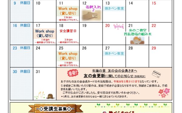 NEW 2026年2月28日おしらせadmin 3月の工作室ご利用について (2月28日現在)いつも丹波年輪の里をご利用いただき誠にありがとうございます。下記の日程は、工作室をご利用いただけません。 3月 3日(火) 終日 *特別教室のため 3月 11日(水)終日 *特別教室のため 3月 17日(火 […]